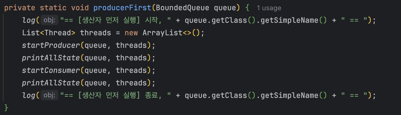 - 생산자 먼저인 producerFirst를 호출하면 producer1 -> producer2 -> producer3 -> consumer1 -> consumer2 -> consumer3 순서로 실행된다.