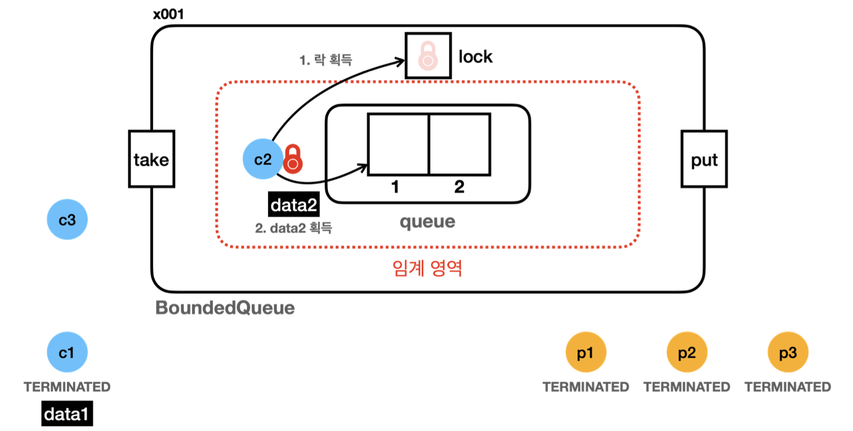 - 임계 영역은 synchronized를 영역을 뜻한다. 스레드가 이 영역에 들어가려면 모니터 락( lock )이 필요하다. 설명을 단순화하기 위해 BoundedQueue의 버전 정보는 생략한다.