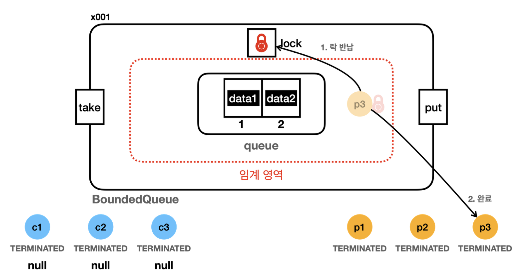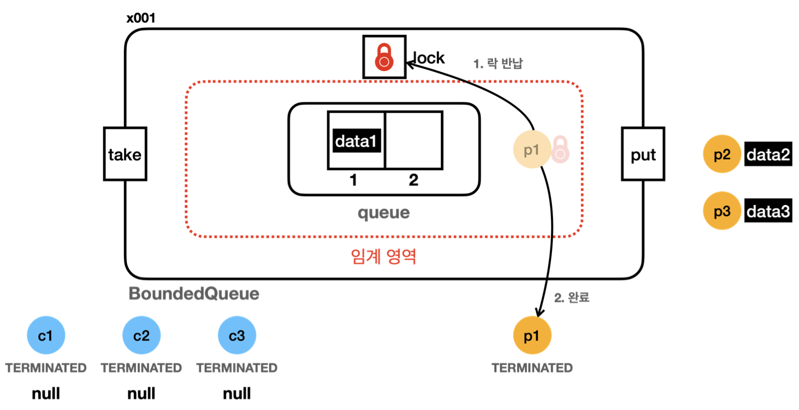 - 생산자 스레드 먼저 실행의 경우 p3 가 보관하는 data3 은 버려지고, c3는 데이터를 받지 못한다. ( null을 받는다.)