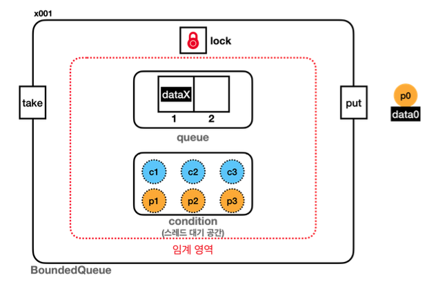 - 아직 생산자, 소비자용 스레드 대기 공간을 따로 분리하지 않았기 때문에 기존 방식과 같다고 보면 된다. 다만 구현을 synchronized 로 했는가 아니면 ReentrantLock 을 사용해서 했는가에 차이가 있을 뿐이다
