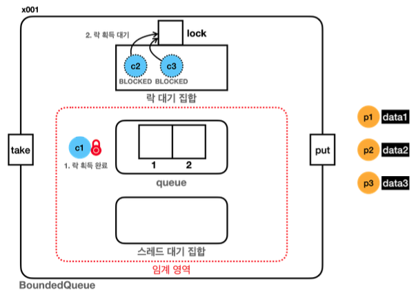 c1 나중에 락을 반납할 것이다. 그러면 c2 , c3 중에 하나가 락을 획득해야 한다. 그런데 잘 생각해 보면 락을 기다리는 c2 , c3 어딘가에서 관리가 되어야 한다. 그래야 락이 반환되었을 자바가 c2 , c3 중에 하나를 선택해서 락을 제공할 있다. 예를 들어서 List , Set , Queue 같은 자료구조에 관리가 되어야 한다. 그림에서는 c2 , c3 단순히 "BLOCKED" 상태로 변경만 되었다. 그래서 관리되는 것처럼 보이지는 않는다.