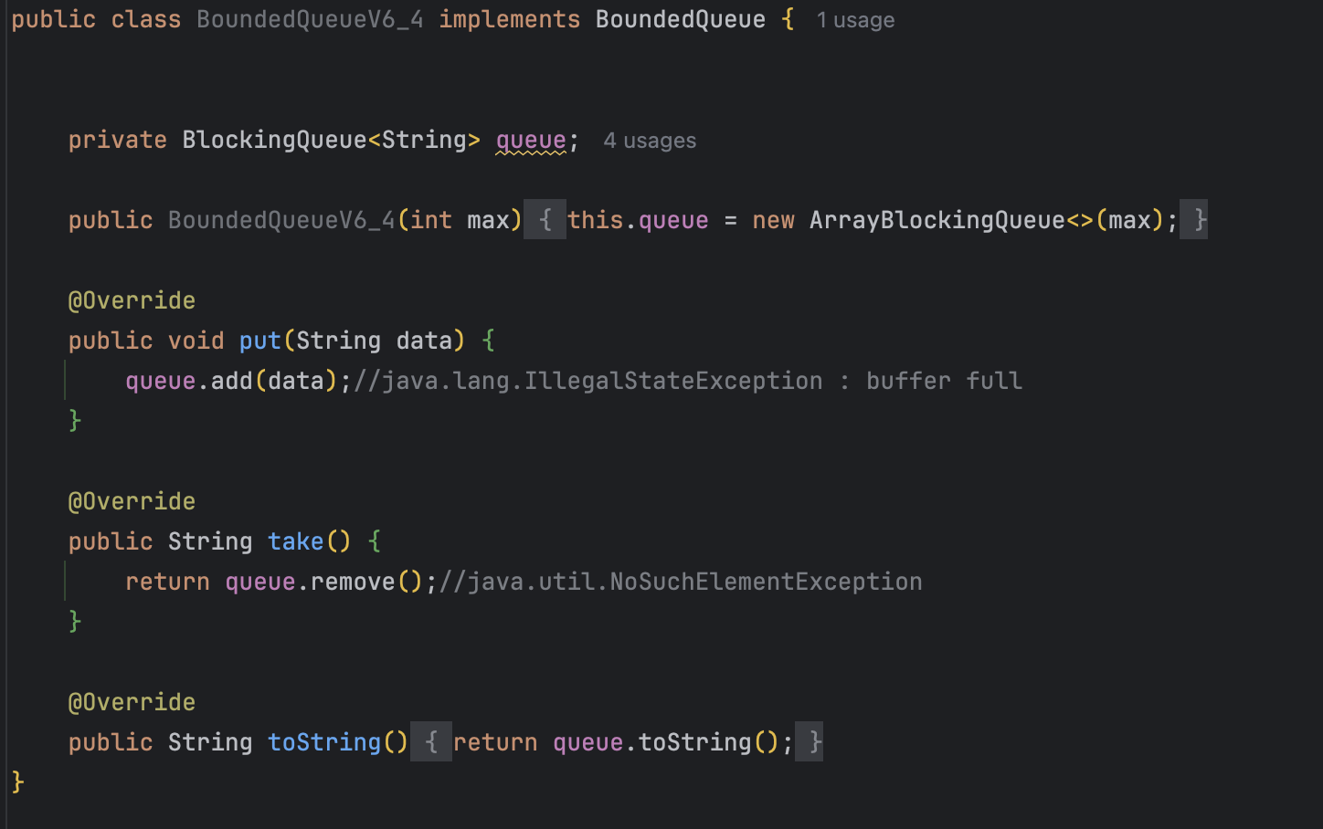 - BlockingQueue의 구현체가 내부에서 모든 로그를 출력하지는 않기 때문에 로그의 양은 줄어들었다. 실제 기능은 BoundedQueueV5와 같다고 생각하면 된다.