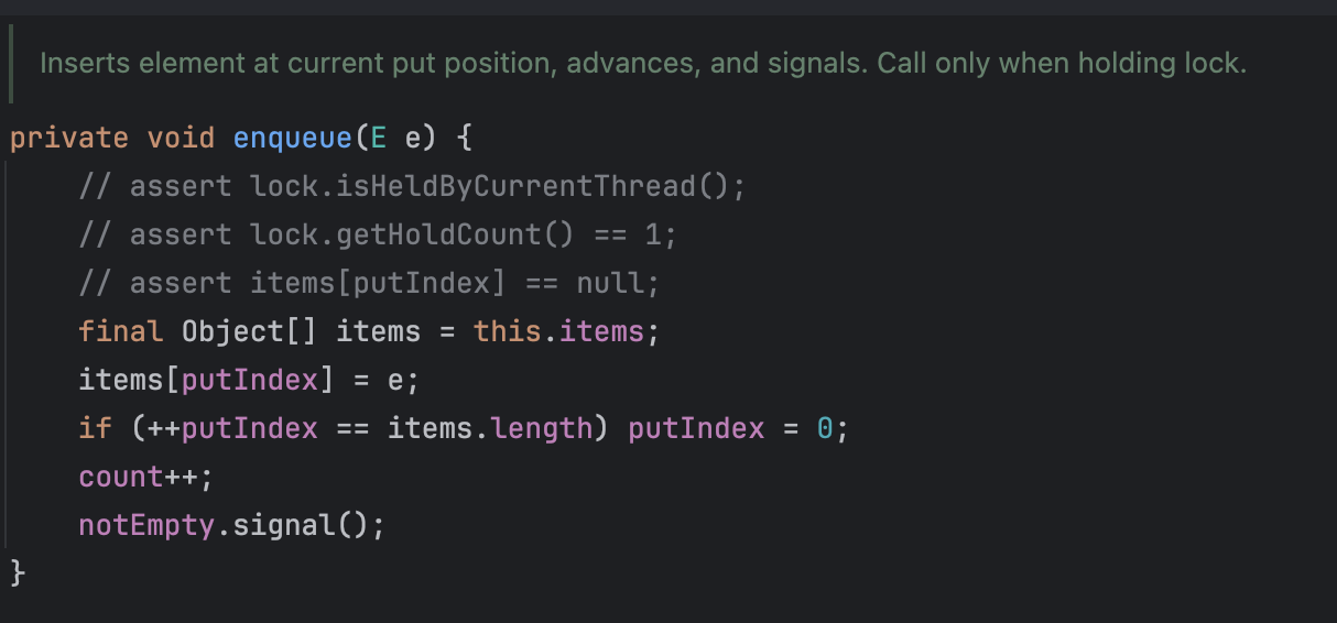 - 앞서 우리가 구현한 BoundedQueueV5와 비슷하게 구현되어 있다. ArrayBlockingQueue는 내부에서 ReentrantLock을 사용한다.