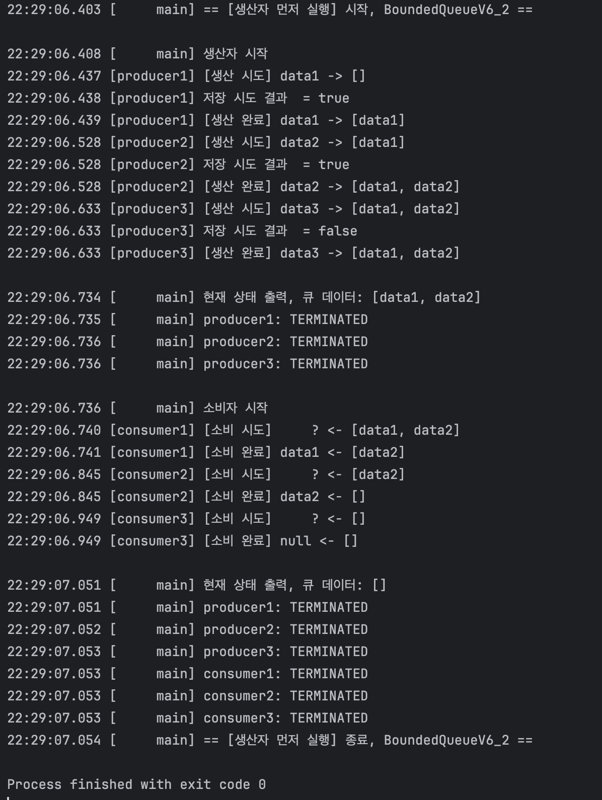 - 실행 결과는 앞서 만든 BoundedQueueV5와 같기 때문에 생산자 먼저 실행만 출력했다.