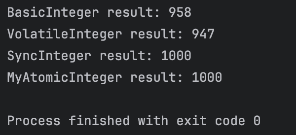 - 실행 결과를 보면 VolatileInteger 도 여전히 1000이 아니라 더 작은 숫자가 나온다.