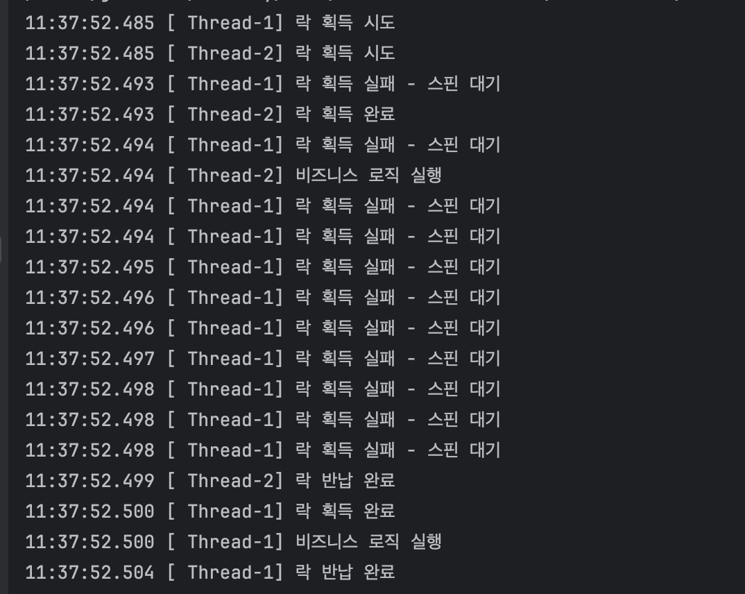- 락 획득 실패 - 스핀 대기 로그가 반복해서 남는다.