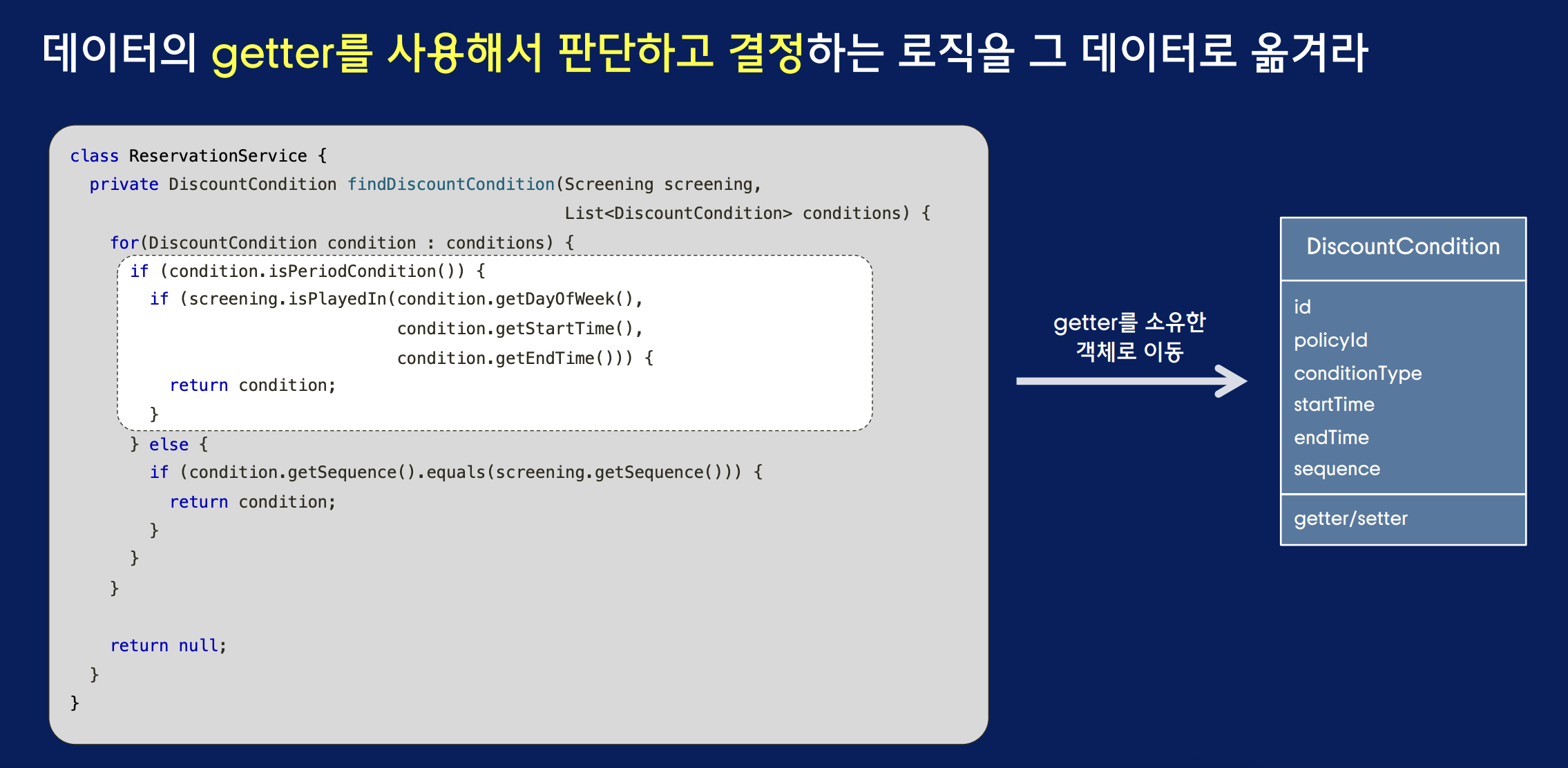 - 이처럼 데이터를 사용하는 로직을 데이터를 보유한 클래스 쪽으로 이동시키는 작업을 객체지향에서는 책임의 이동이라고 한다.