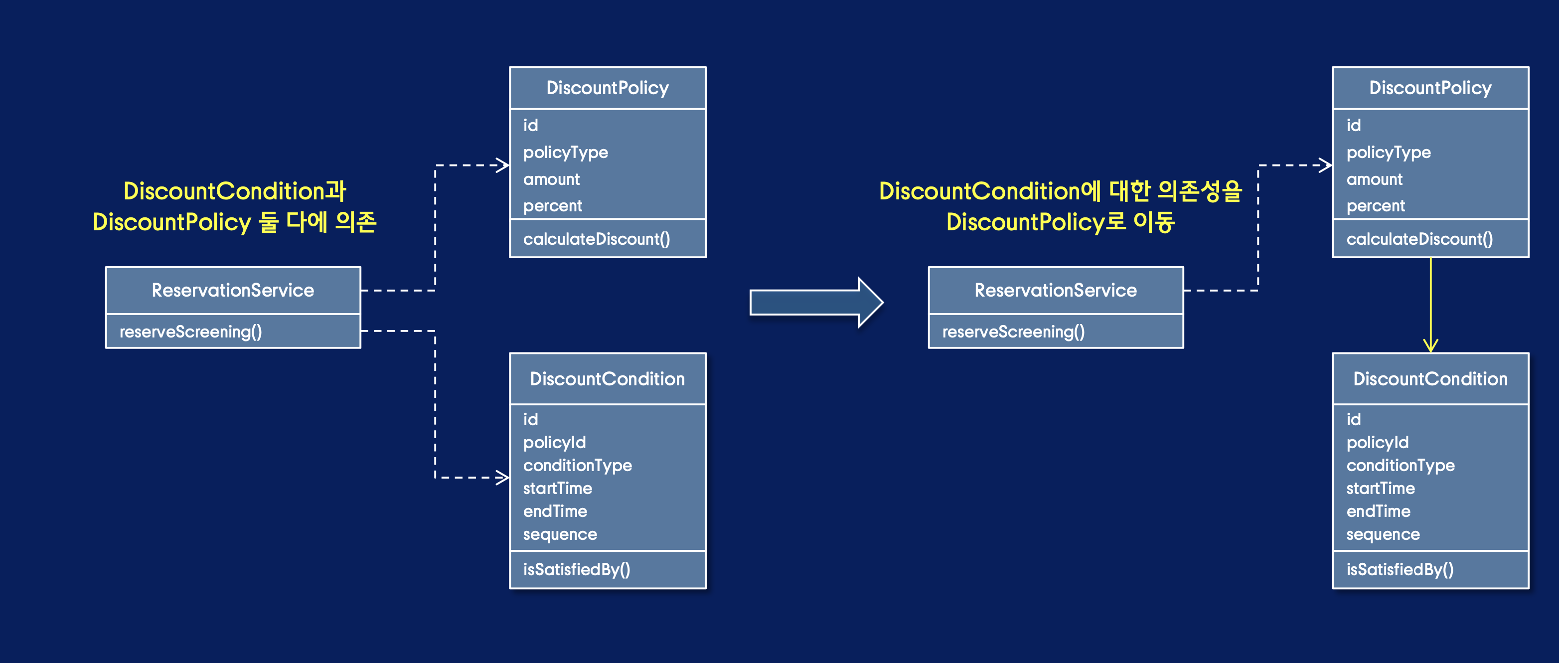 - Reservation Service가 Discount Policy와 Discount Condition 둘 중 하나에만 의존하도록 구조를 수정