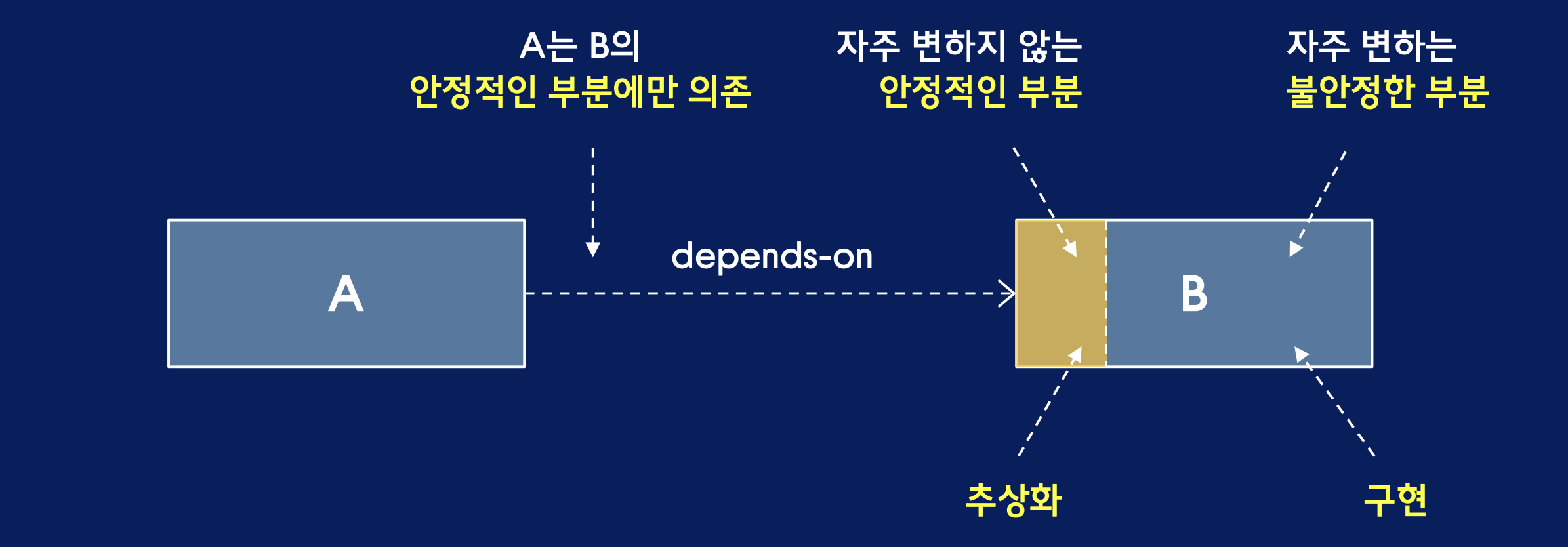 - A -> B에 의존한다면 B에서 자주 변하지 않는 안정적인 부분을 자주 변하는 불안정한 부분으로부터 코드 안에서 명확히 분리한다.