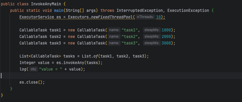 - invokeAny()는 한 번에 여러 작업을 제출하고, 가장 먼저 완료된 작업의 결과를 반환한다.
