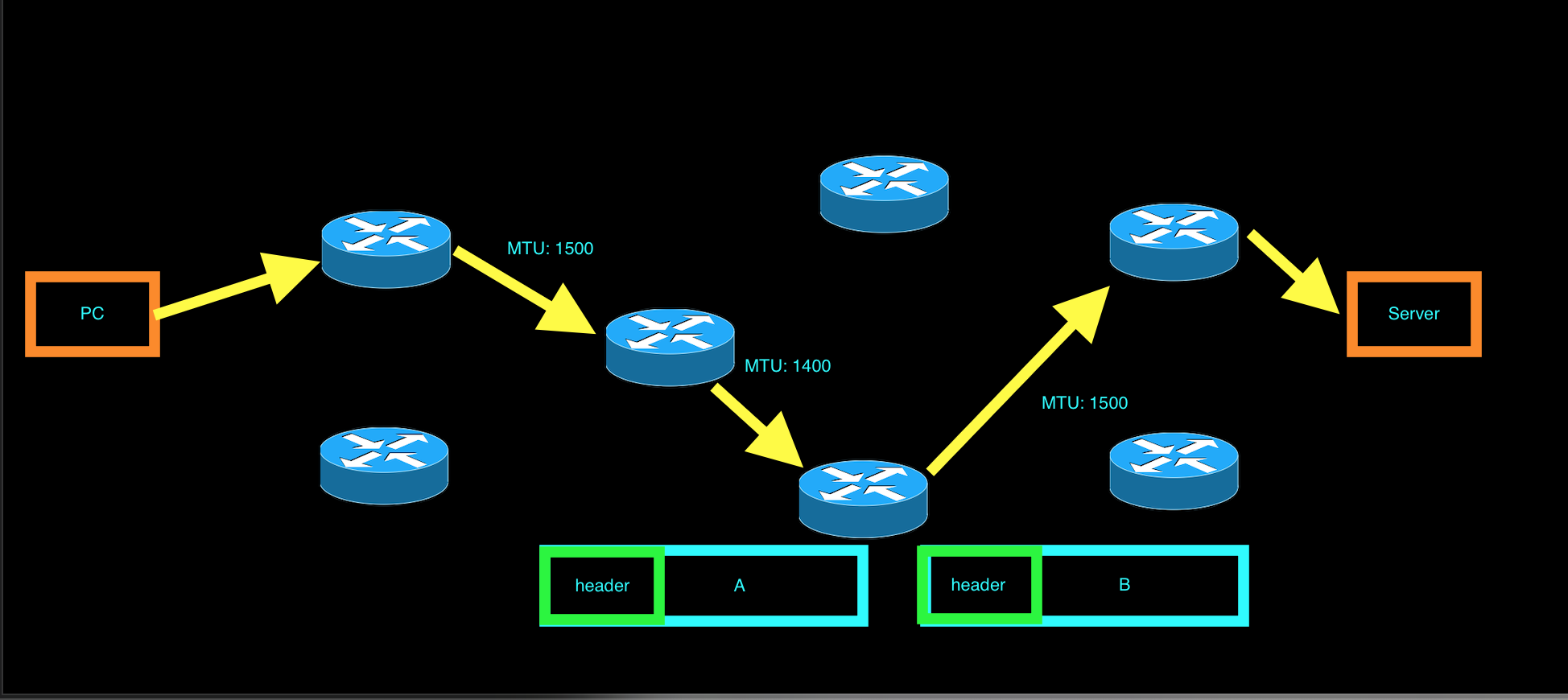 - MTU가 라우터마다 다르기 때문에 기존 1개였던 패킷을 2개로 쪼갤 수밖에 없다.