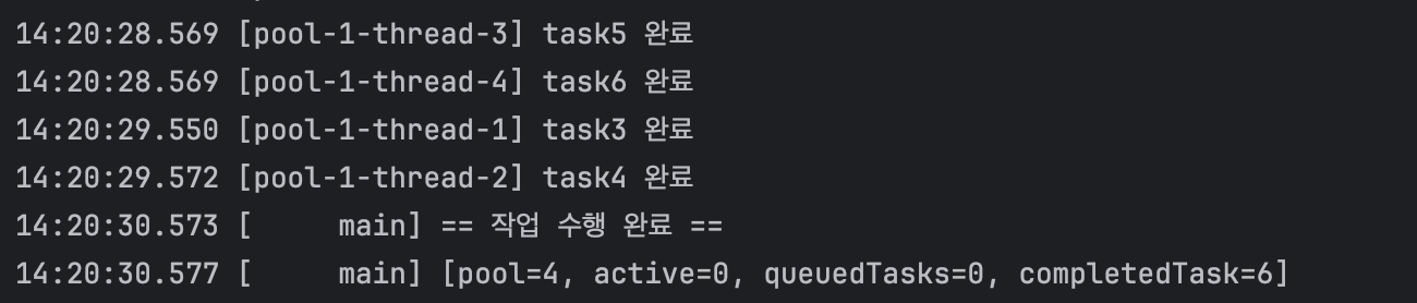 - Executor는 초과 스레드인 스레드 4를 만들어서 task6을 처리한다.