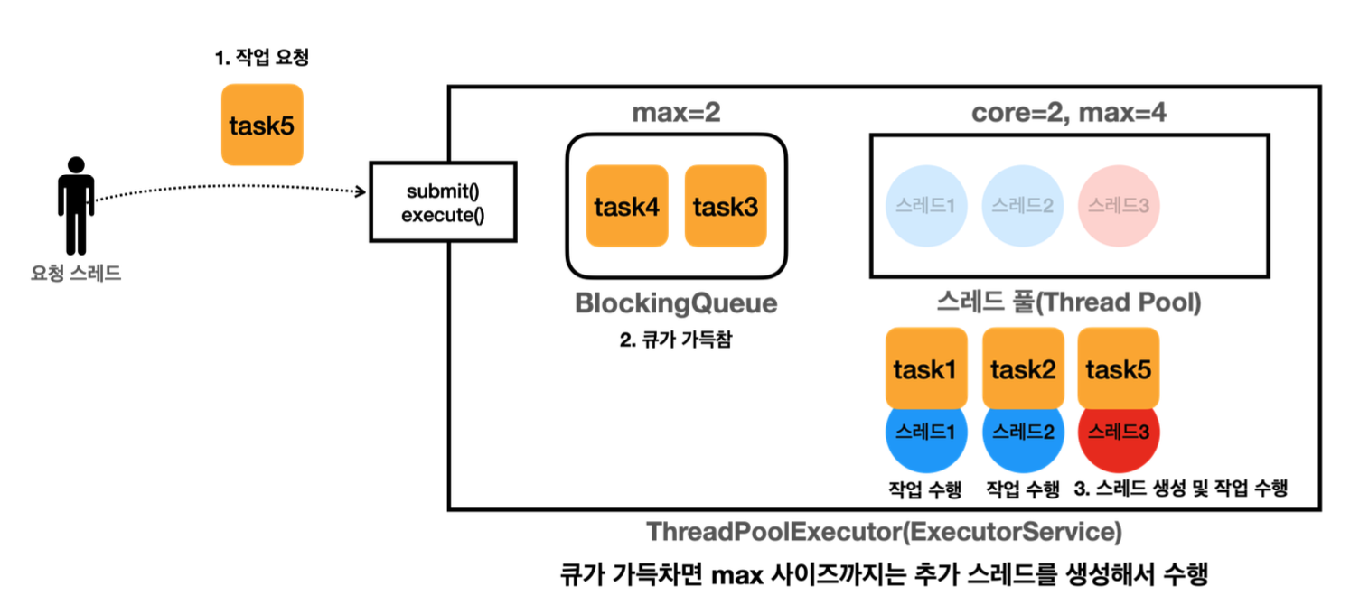 - 큐가 가득 차면 긴급 상황이다. 대기하는 작업이 꽉 찰 정도로 요청이 많다는 뜻이다. 이 경우 Executor는 max(maximumPoolSize) 사이즈까지 초과 스레드를 만들어서 작업을 수행한다.