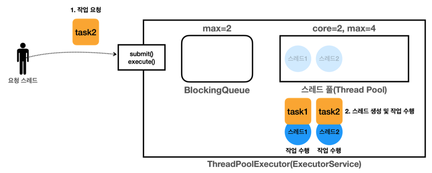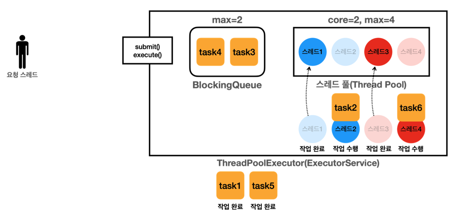 - 스레드 풀에 기본 2개의 스레드를 운영한다. 요청이 너무 많거나 급한 경우 스레드 풀은 최대 4개까지 스레 드를 증가시켜서 사용할 수 있다. 이렇게 기본 스레드 수를 초과해서 만들어진 스레드를 초과 스레드라 하겠다.