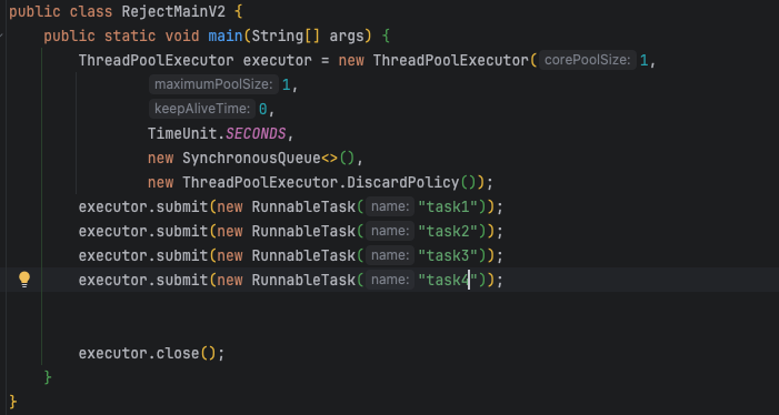 - ThreadPoolExecutor 생성자 마지막에 new ThreadPoolExecutor.DiscardPolicy()를 제공하면 된다.