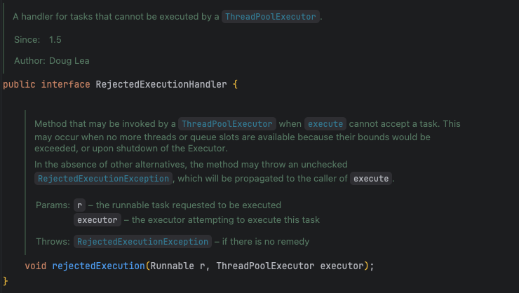 - ThreadPoolExecutor는 거절해야 하는 상황이 발생하면 여기에 있는 rejectedExecution()을 호출한다.
