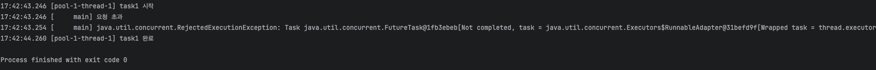 - AbortPolicy는 RejectedExecutionException을 던지는 것을 확인할 수 있다.