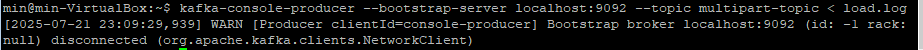 kafka-console-producer --bootstrap-server localhost:9092 --topic multipart-topic < load.log