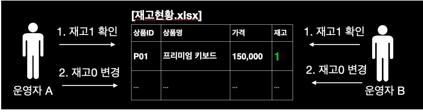 - 운영자 A가 고객 전화를 받고 재고 파일(예: 재고현황. xlsx)을 열어보니 1개가 있어서 "구매 가능하다"라고안내했다. 거의 동시에 운영자 B도 같은 파일을 열어 재고 1개를 확인하고 "구매 가능하다"라고 안내했다.