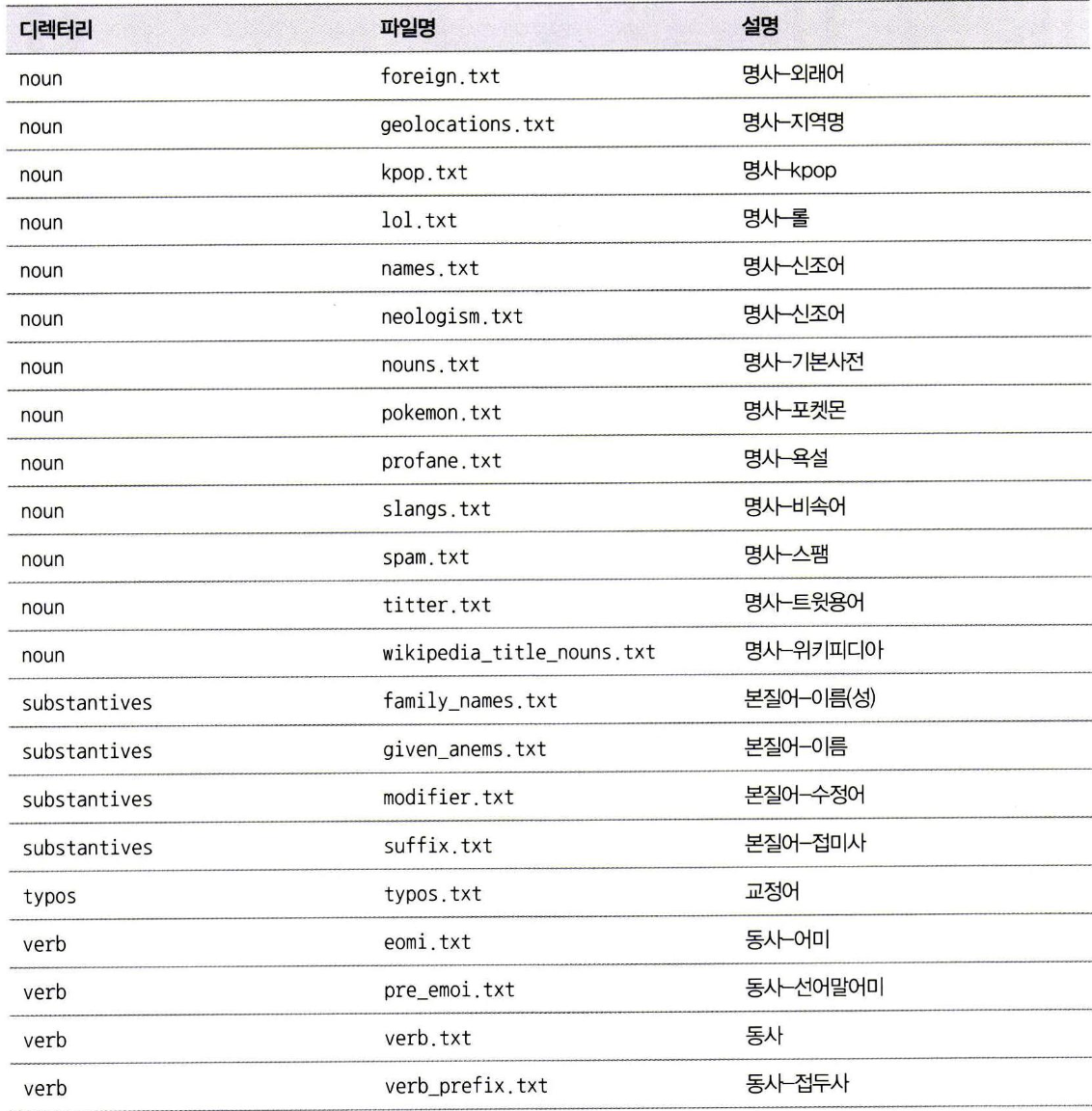 - 형태소 분석기에 사용되는 사전은 open-korean-text 프로젝트에서 별도로 제공된다.