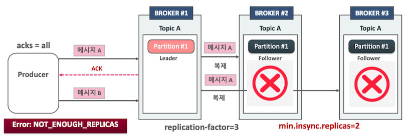 - 만약 Leader가 메시지를 복제 중에 다운될 경우 다음 Leader가 될 브로커에는 메시지가 없을 수 있기 때문에 메시지를 소실할 우려가 있다.