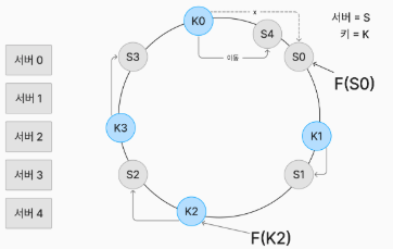 - 어떤 키가 저장되는 서버는 해당 키의 위치로부터 시계 방향으로 링을 탐색해 나가면서 만나는 첫 번째 서버이다.