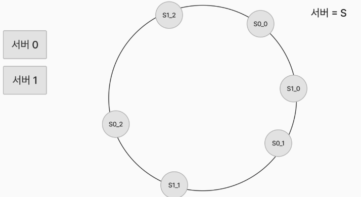 - 가상노드란 실제 노드 또는 서버를 가리키는 노드로 하나의 서버는 링 위에 여러 개의 가상 노드를 가질 수 있다