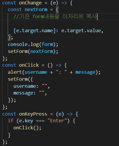 e.target.name을 활용하지 않고 onchange관련 함수 두 개를 따로 만들어 주었다import React, { Component } from "react"; import { useState } from "react/cjs/react.development"; const EventPracticeClass = () => { const [username, setUsername] = useState(""); const [message, setMessage] = useState(""); const onChangeUsername = (e) => setUsername(e.target.value); const onChangeMessage = (e) => setMessage(e.target.value); //onchange함수 두개를 따로 만들어 주었다. const onClick = () => { alert(username + ": " + message); setUsername(""); setMessage(""); }; const onKeyPress = (e) => { if (e.key === "Enter") { onClick(); } }; return ( <div> <input type="text" name="username" placeholder="사용자명" value={username} onChange={onChangeUsername} /> <input type="text" name="message" placeholder="아무거나 입력해 주세요" value={message} onChange={onChangeMessage} onKeyPress={onKeyPress} /> <button onClick={onClick}>확인</button> </div> ); }; export default EventPracticeClass; - UseState을 객체를 받도록 변환