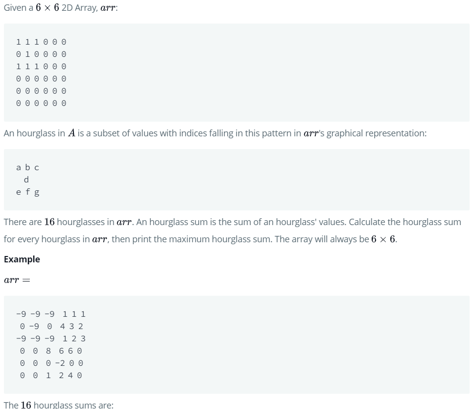 public static int max; public static int hourglassSum(List<List<Integer>> arr) { max = Integer.MIN_VALUE; for(int i=0;i<arr.size()-2;++i){//행의 길이 -2 for(int j=0;j<arr.get(i).size()-2;++j){ // 열의 길이 -2 까지만 for문을 돈다(모래시계의 시작위치 기준) counting(arr,i, j);//모래시계의 값을 계산해주는 함수 } } return max; } public static void counting(List<List<Integer>> arr,int startI,int startJ){ int sum = 0; for(int i=startI;i<=startI+2;++i){ // 시작위치로 부터 행 +2 ,열 +2 위치까지 모든 값을 더해준다 for(int j=startJ;j<=startJ+2;++j){ sum += arr.get(i).get(j); } } sum -= arr.get(startI+1).get(startJ); //중간의 모래시계의 포함 되지 않는부분을 빼준다 sum -= arr.get(startI+1).get(startJ+2); max = Math.max(max,sum); }