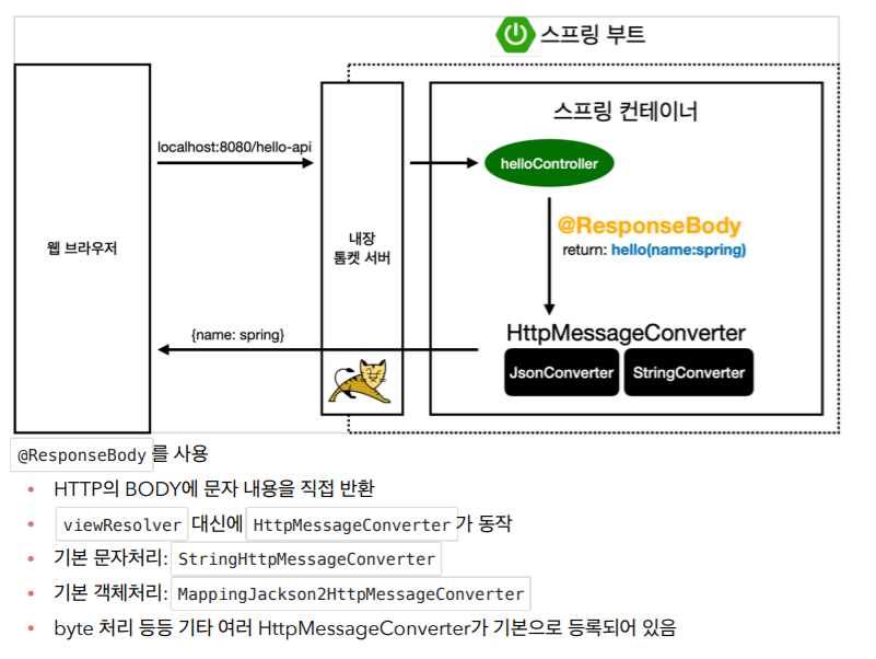 - @ResponseBody에서 객체를 넘기면 Spring에서 HttpMessageConverter가 동작하게 된다.
