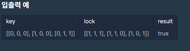 입출력 - key를 시계 방향으로 90도 회전하고, 오른쪽으로 한 칸, 아래로 한 칸 이동하면 lock의 홈 부분을 정확히 모두 채울 수 있습니다.
