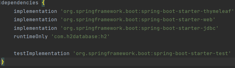 - build.gradle 파일에 jdbc, h2 데이터베이스 관련 라이브러리 추가