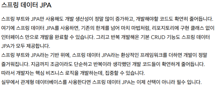 - 주의: 스프링 데이터 JPA는 JPA를 편리하게 사용하도록 도와주는 기술입니다. 따라서 JPA를 먼저 학습한 후에 스프링 데이터 JPA를 학습해야 합니다.