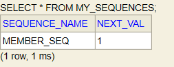 | sequenceName | 데이터베이스에 등록되어 있는 시퀀스 이름 | hibernate_sequence |