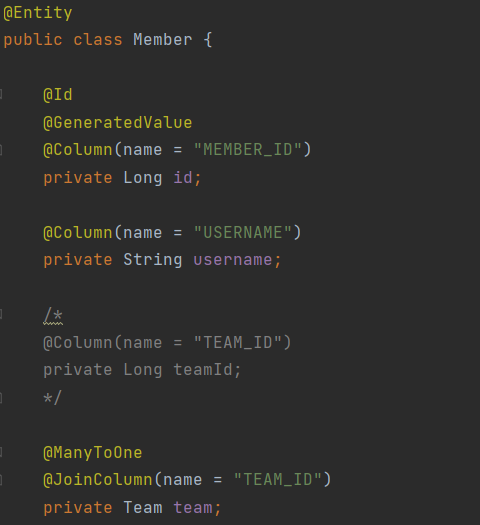- 참조가 아닌 외래키 값을 그대로 가지고 있다(문제가 많은 코드)