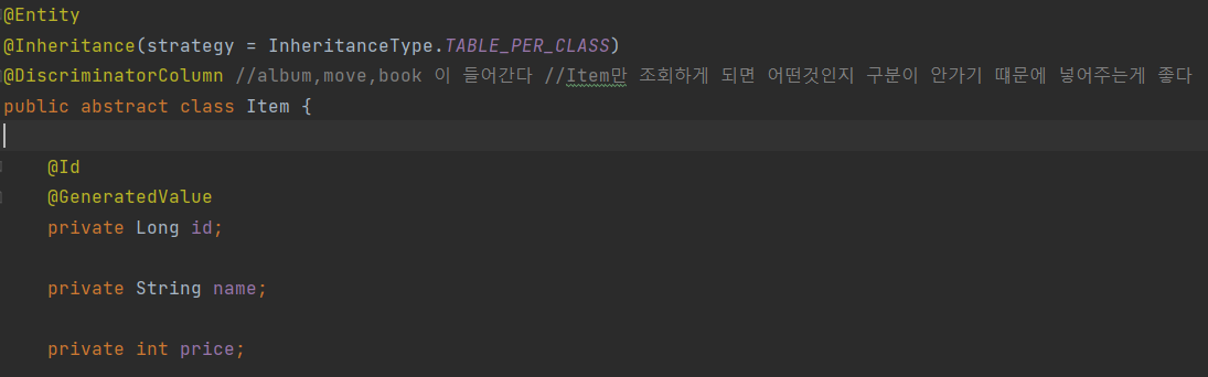 Item Entity의 @Inheritance 전략을 JOINED로 설정, @DiscrimincatorColumn을 통해 어떤것인지 구분이 가능하도록한다.