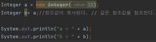 - Integer 같은 래퍼 클래스나 String 같은 특수한 클래스는 공유 가능한 객체이지만 변경 X