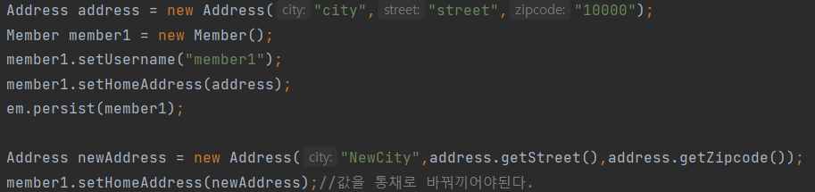 • 만약 이렇게 의도해서 쓴 것이라면 값 타입을 쓰면 안 되고 엔티티를 사용해야 한다.