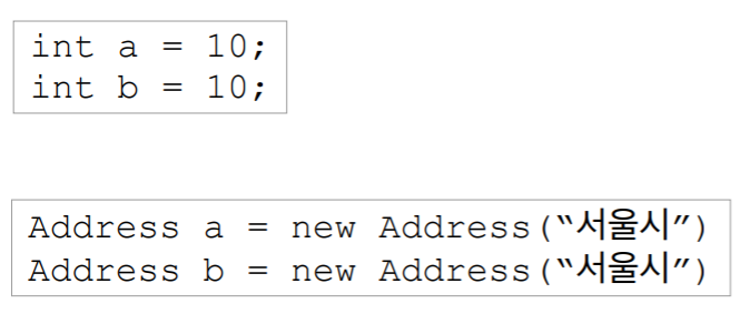 값 타입: 인스턴스가 달라도 그 안에 값이 같으면 같은 것으로 봐야 함