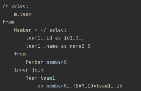 - 단일 값 연관 필드: @ManyToOne, @OneToOne, 대상이 엔티티(ex: m.team)