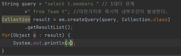 컬렉션 값 연관 경로: 묵시적 내부 조인 발생, 탐색 X