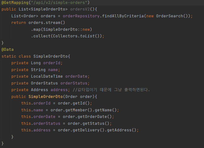Ch03. API 개발 고급(지연 로딩과 조회 성능 최적화) - 간단한 주문 조회 V2(Entity -> DTO로 변환)