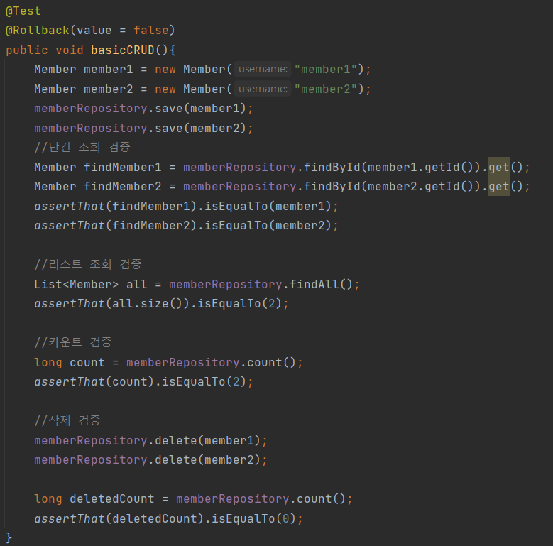 - 기존 순수 JPA 기반 테스트에서 사용했던 코드를 그대로 SpringDataJPA Repository 기반 테스트로 변경해도 동일한 방식으로 동작
