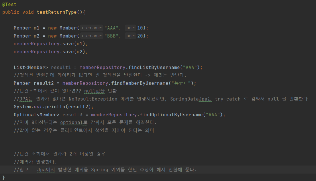 단건으로 지정한 메서드를 호출하면 스프링 데이터 JPA는 내부에서 JPQL의 Query.getSingleResult() 메서드를 호출한다. 이 메서드를 호출했을 때 조회 결과가 없으면 javax.persistence.NoResultException 예외가 발생하는데 개발자 입장에서 다루기가 상당히 불편하다.