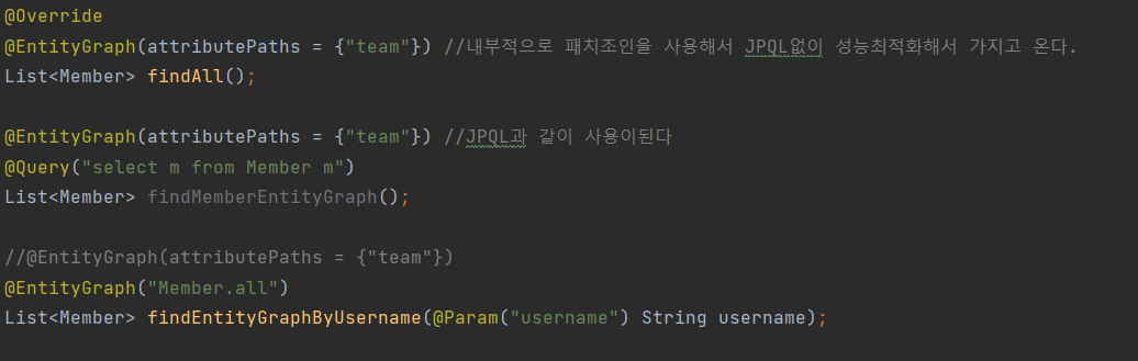 - 앤티티에 NamedEntityGraph를 적어주면 이름으로 EntityGraph를 가지고 올 수 있다.