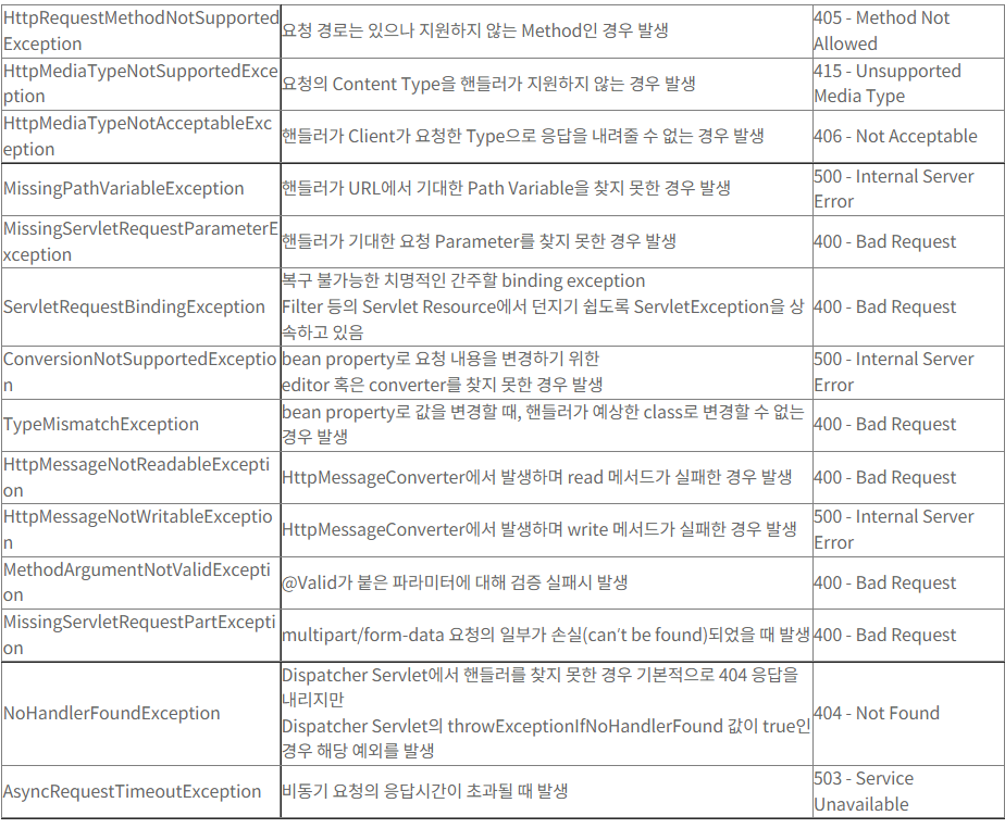 - Dispatcher Servlet내에서 발생하는 예외 (Controller, Service, Repository 등등)