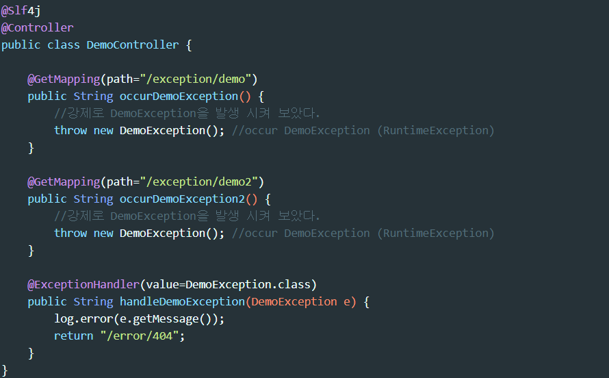 예시 - DemoController내에서 발생한 DemoException에 대해서는 handleDemoException 메소드에서 모두 처리를 해준다