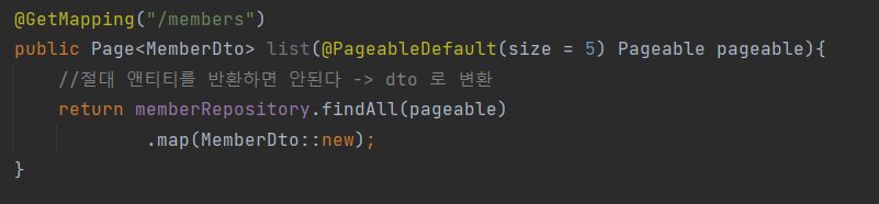 - Pageable, Page를 파리 미터와 응답 값으로 사용 히지 않고, 직접 클래스를 만들어서 처리한다. 그리고 직접 PageRequest(Pageable 구현체)를 생성해서 리포지토리에 넘긴다.