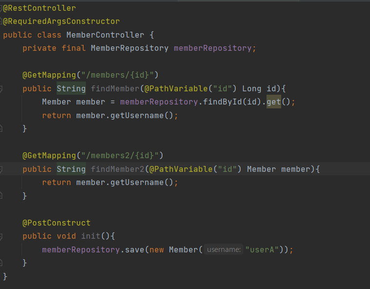 - HTTP 요청은 회원 id를 받지만 도메인 클래스 컨버터가 중간에 동작해서 회원 엔티티 객체를 반환