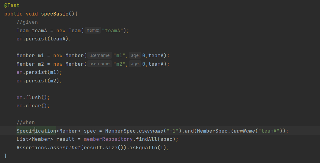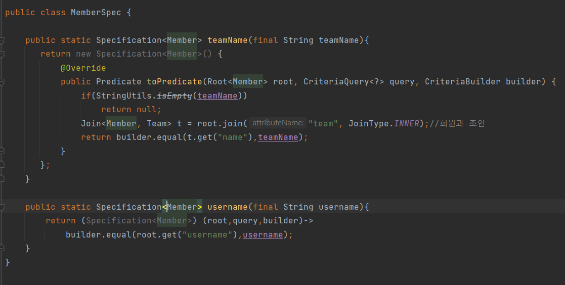- findAll 을 보면 회원 이름 명세( username )와 팀 이름 명세( teamName )를 and 로 조합해서 검색 조건으로 사용